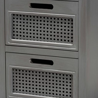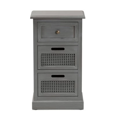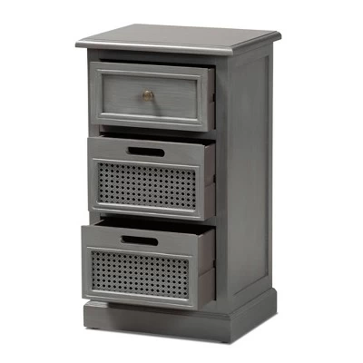 With a crisp, contemporary outline, the Sheldon nightstand brings modern convenience to your bedside. Made in China, this nightstand is constructed from sturdy wood featuring a neutral gray finish that complements any interior style. Three drawers provide secure storage for bedside essentials while reserving the tabletop for nightly use. Woven synthetic rattan drawer faces lend vintage charm. Fully assembled, the Sheldon features inset detailing that lends visual depth and showcases fine craftsmanship. One antique brass finished metal knob completes the look, making the Sheldon nightstand a fantastic upgrade to the modern home. Dimensions: 27.60″ High x 15.70 ” Wide x 12.60″ Deep; Top Drawer Dimensions: 5.90″ High x 11.80″ Wide x 10.80″ Deep; Bottom Drawers Dimensions: 7.10″ High x 11.80″ Wide x 10.80″ Deep;