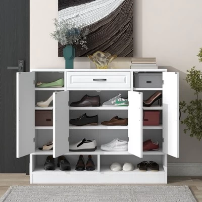 - 【Stylish and Modern Design】This shoe cabinet features a classic shape and a smooth, solid color finish that blends seamlessly with any decor. The door panels are beautifully crafted and the grooved lines add a touch of elegance.