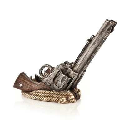 Display your bottle in old western style with this double gun bottle holder. Sized to fit any standard sized bottle, the velvet bottom will protect counter and tabletop surfaces is decorative and functional. Durable and colorful polyresin constructionAccommodates 1 standard wine bottleVelvet backing protects tabletopIdeal for counter and table top displayMakes a great gift