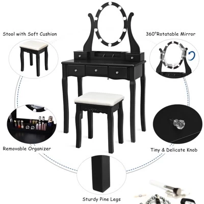 Topbuy Vanity table set is a stylish and functional contemporary piece of furniture to your home. 5 drawers, 6 compartments and a large tabletop offer ample storage space for your makeup, jewelry, nail polish, hair accessories and other beauty supplies. Cushioned seat is solid and comfortable. Rotating oval mirror with 10 LED bulbs give you a clear view of your face and hair from angles. Wish Topbuy will see your beauty.