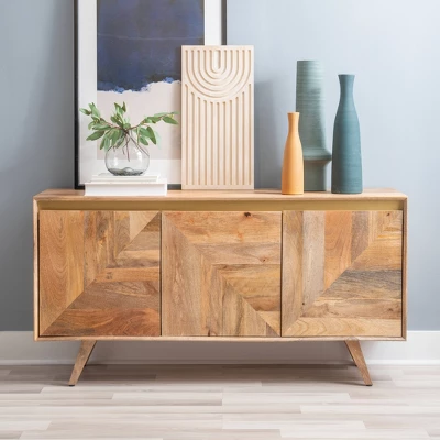 Striking knots and grain patterns in the mango wood of this console come to life in geometric cuts that pair wonderfully in both traditional and contemporary decor settings. 4 shelves support up to 45 lbs each, offering generous storage for dinnerware, electronics, or any other items you’d like to keep tucked away but readily accessible. Measuring at 58” L X 16” D X 30” H, this piece is perfect as a tv stand or extra storage in your dining room, entryway or bedroom.