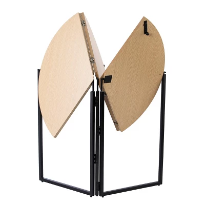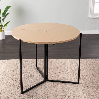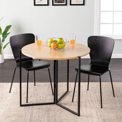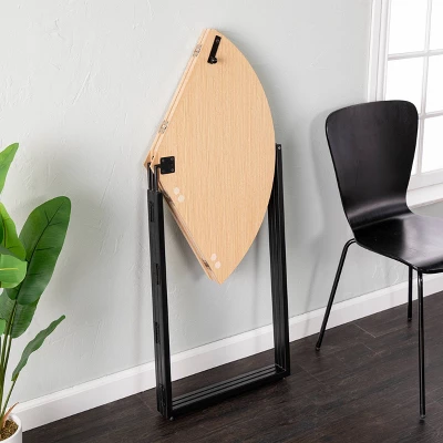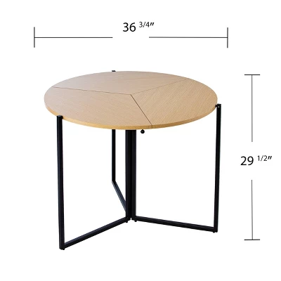 Entertain more in your small space with the Aiden Lane Valxina Round Folding Dining Table. A spacious tabletop provides plenty of room for dining and relaxing, while a pull-and-turn lever system allows the entire table to fold flat for easy storage. Truly multifunctional, this two-tone table works as extra seating at family game night or in your dining room, or unfolds in your open concept space as a homework station or craft table. Make the most of your living space with this collapsible dining table. Overall: 36.75” W x 36.75” D x 29.5” H