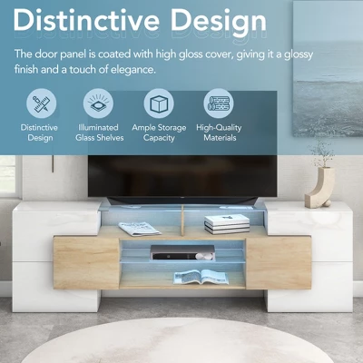 The unique design of this TV cabinet is different from ordinary cabinets. Comes with a glowing glass shelf and LED lights for a modern appeal. The door panels are finished with a high-gloss coating for a glossy finish that exudes elegance. With clean lines and a unique shape, this cabinet will complement any home.