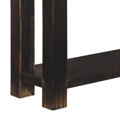 Accent your favorite space with a touch of rustic charm by adding this Sofa Table to your home decor. With Its durable wood construction, this table is sure to stand up to the rigors of heavy daily use. The table is finished in a vintage weathered black tone that has the right amount of distressing to give it a laid back vibe. Just stow your remote controls or gadgets. in the four drawers and show off accent pieces and more on the bottom shelf.