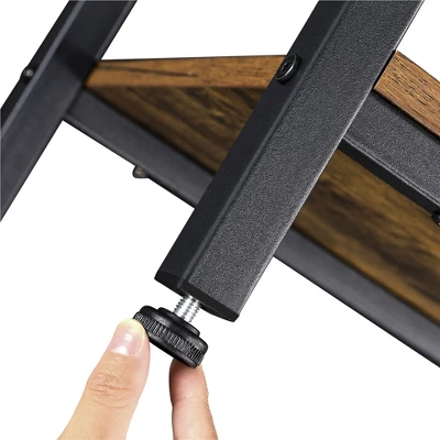 - Spruce up an unused/messy corner of your kitchen with this chic baker’s rack. Founded atop four legs in a matte black finish, this piece features a quality iron frame, P2 MDF, and water- and heat-resistant covering that’s very easy to clean. Offering four shelves and a mesh hanging area, you can put go-to kitchen needs and smaller appliances like microwaves, coffee makers well-organized and handy. 10 hooks are provided for your convenience. The distressed brown color of this kitchen utility storage shelf can coordinate with a variety of styles especially rustic barn-style and industrial design.